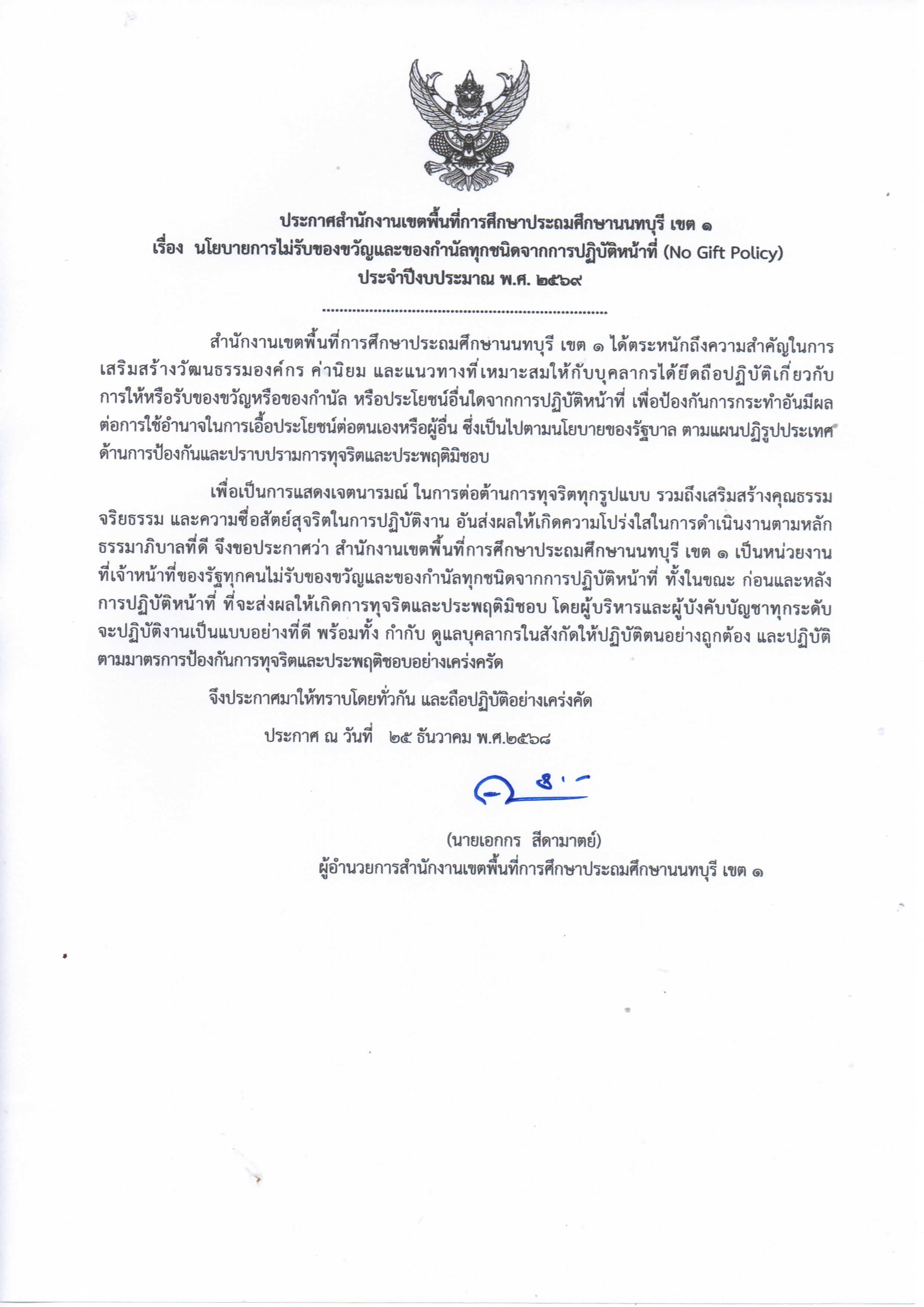 ประกาศเจตนารมณ์และการสร้างวัฒนธรรมตามนโยบาย No Gift Policy จากการปฏิบัติหน้าที่