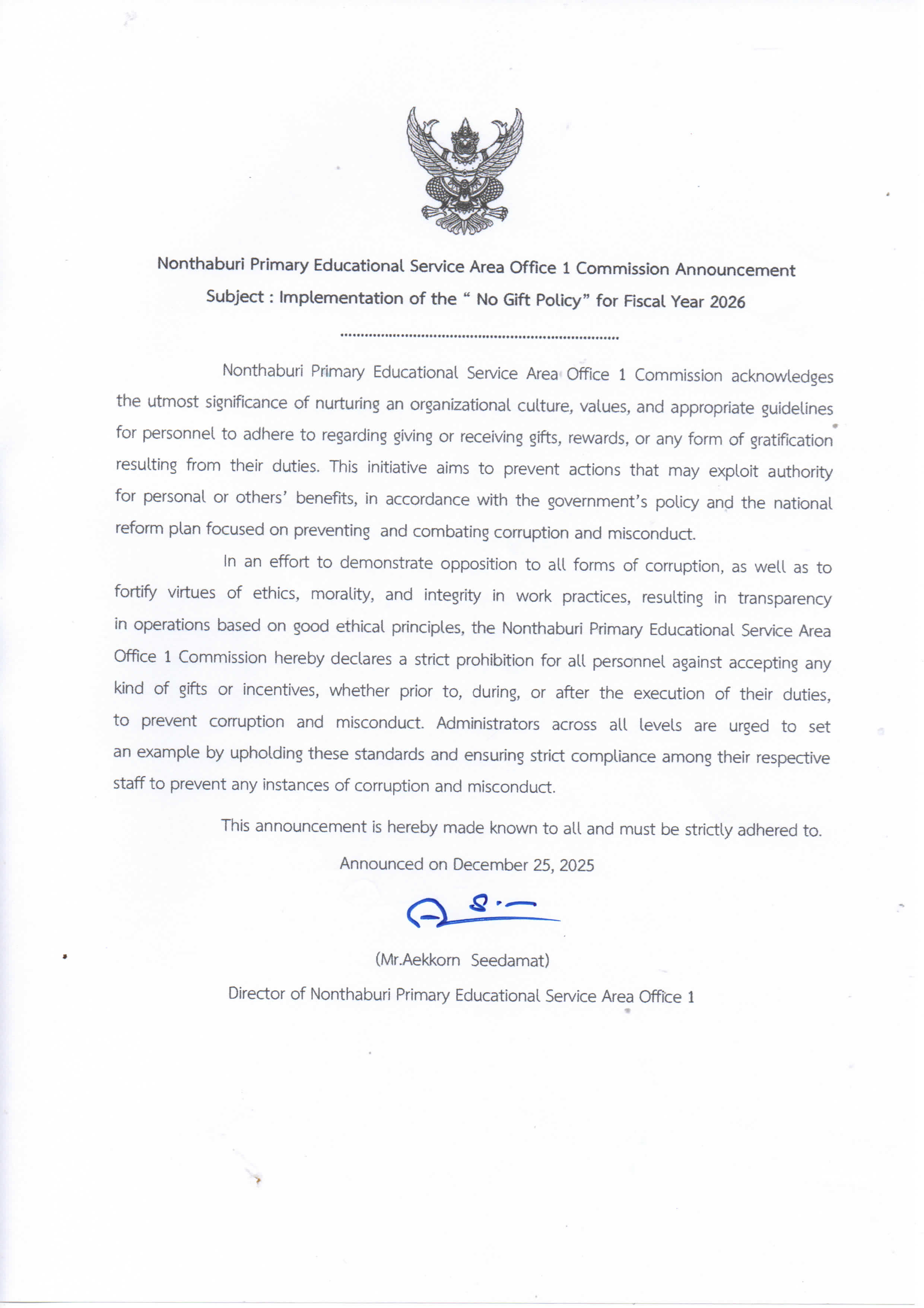 ประกาศเจตนารมณ์และการสร้างวัฒนธรรมตามนโยบาย No Gift Policy จากการปฏิบัติหน้าที่ ประจำปีงบประมาณ พ.ศ. 2569