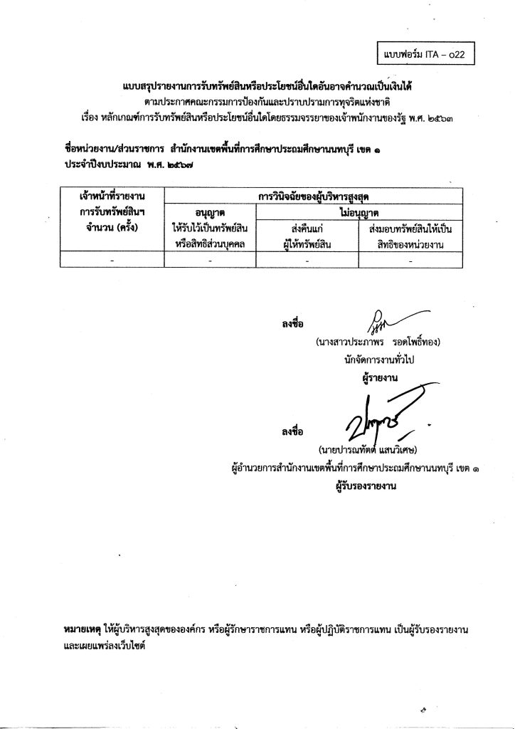 แบบสรุปรายงานการรับทรัพย์สินหรือประโยชน์อื่นใดอันอาจคำนวณเป็นเงินได้ ประจำปีงบประมาณ พ.ศ. ๒๕๖๗