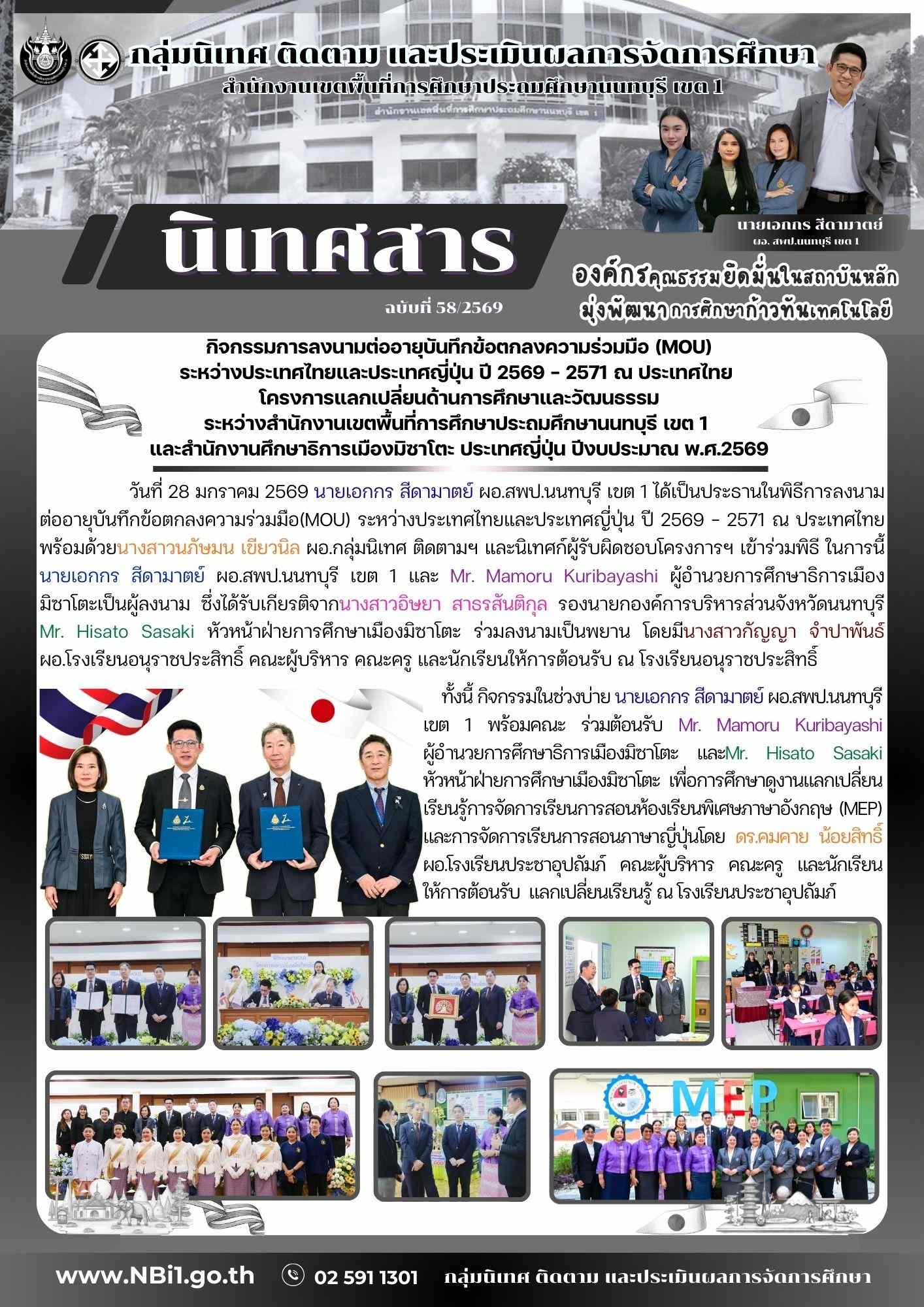 กิจกรรมการลงนามต่ออายุบันทึกข้อตกลงความร่วมมือ (MOU) ระหว่างประเทศไทยและประเทศญี่ปุ่น ปี 2569 - 2571 ณ ประเทศไทย โครงการแลกเปลี่ยนด้านการศึกษาและวัฒนธรรม ระหว่างสำนักงานเขตพื้นที่การศึกษาประถมศึกษานนทบุรี เขต 1 และสำนักงานศึกษาธิการเมืองมิซาโตะ ประเทศญี่ป